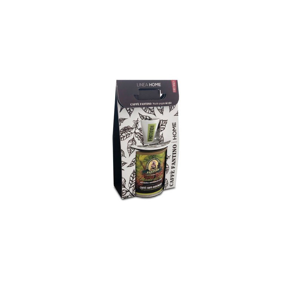 Stilvolle Geschenkverpackung, bestehend aus Fantino "BIO" gr.250 Bio Kaffee gemahlen für Kaffeezubereiter mit BIO Espressotasse Fantino und dekorierter Untertasse.