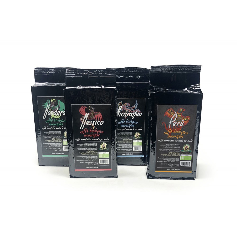 Nuestra mezcla de café orgánico certificado, 100% Arábica, dedicada al uso en cafetera moka, molida y envasada en paquete de gr. 250 vacío, elegantemente empaquetado.