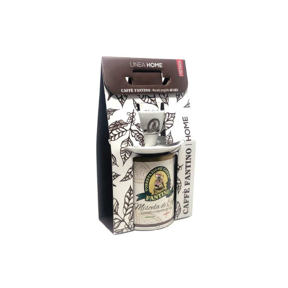 Elégant coffret cadeau, composé de boîte Fantino "Moka" gr.250 de café moulu pour cafetière avec tasse expresso traditionnelle Fantino.